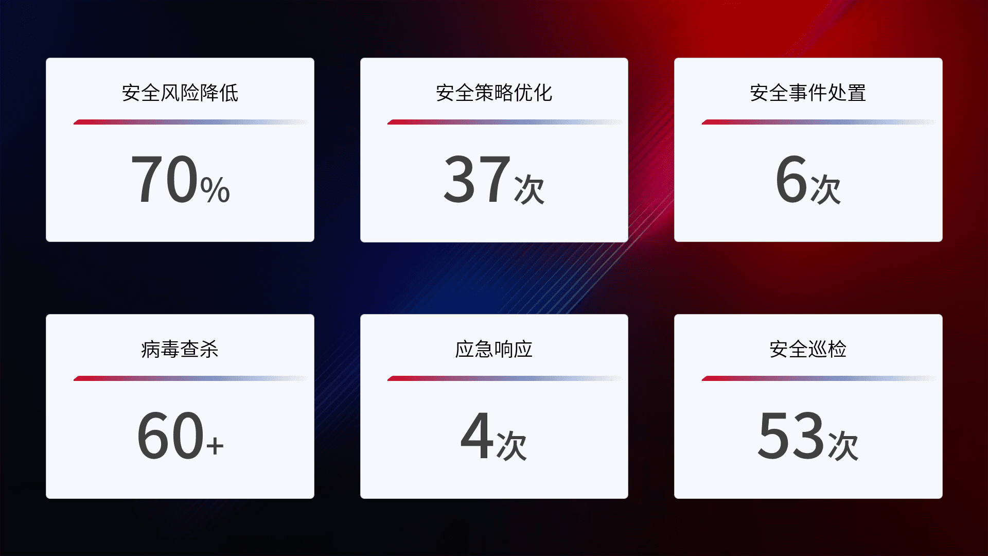 提供全面的安全事件报告体系,,,包括处置报告、、、周报、、、季度和年度总结,,,结合持续监控,,,,帮助客户深入了解网络安全状况。。。。